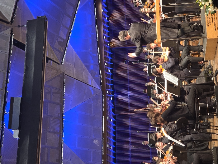 An orchestra performs under a conductor on a stage with blue geometric backdrop. Musicians play violins and other instruments. The conductor raises his arms, directing the ensemble. A large black structure stands to the left. Flowers are visible to the right.