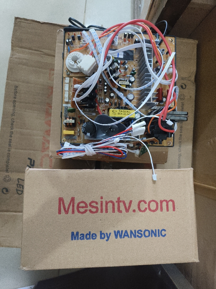 - "The image displays an electronic circuit board, consistent with a television mainboard or power supply, resting on a partially open brown cardboard box in Alue Mudem, Indonesia" by FM-j9BSH3, licensed under CC BY 4.0