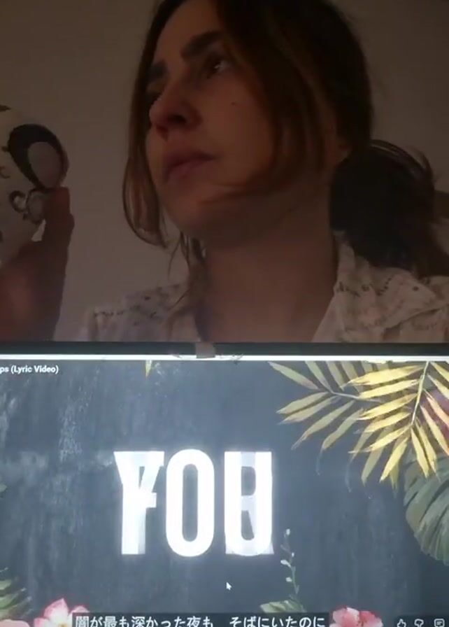 A woman is shown in the top portion of the video, drinking from a white mug while watching a music video on a laptop. The music video shows tropical flowers and ferns on a black background. White text appears in the center of the video, starting with the word "THERE" then "YOU" then "IN YOUR DARK" then "BUT" then "WHERE." Subtitles are displayed in Japanese.