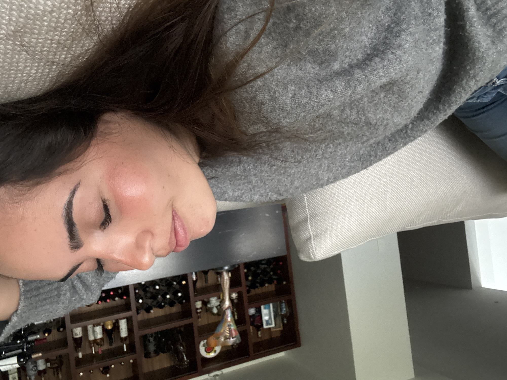 A woman is lying on a light-colored couch, with her head near a dark brown shelf unit that contains various bottles, some appearing to be wine