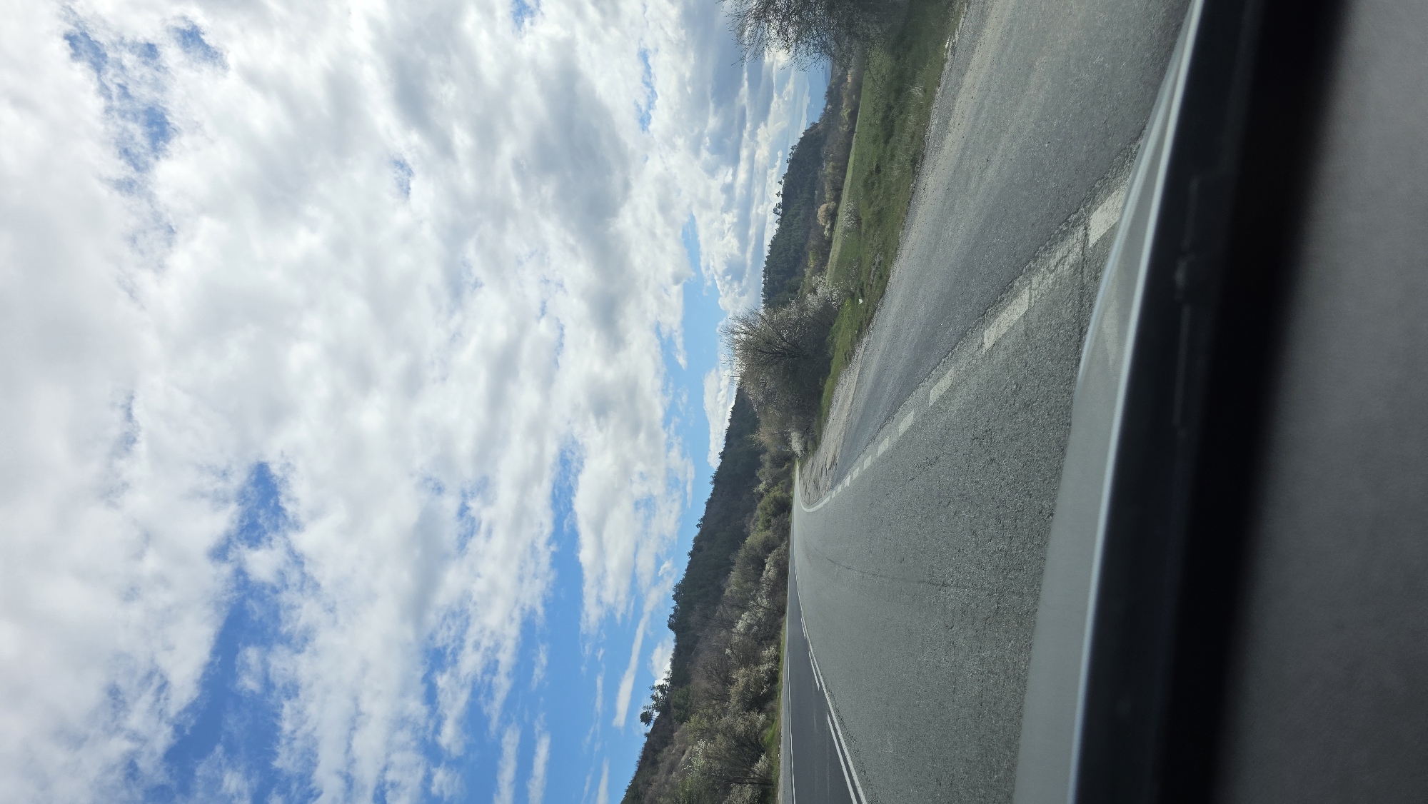 The image depicts a view from inside a vehicle, likely a car, driving on a paved road. The road has a solid white line marking its edge. To the left of the road, there is a hilly landscape with vegetation, some of which appears to be flowering trees or shrubs. The sky above is partially covered with clouds, with patches of blue visible. The location is indicated to be in Kocherinovo, Bulgaria, though specific landmarks are not visible to confirm this. No people or animals are clearly visible in the frame.