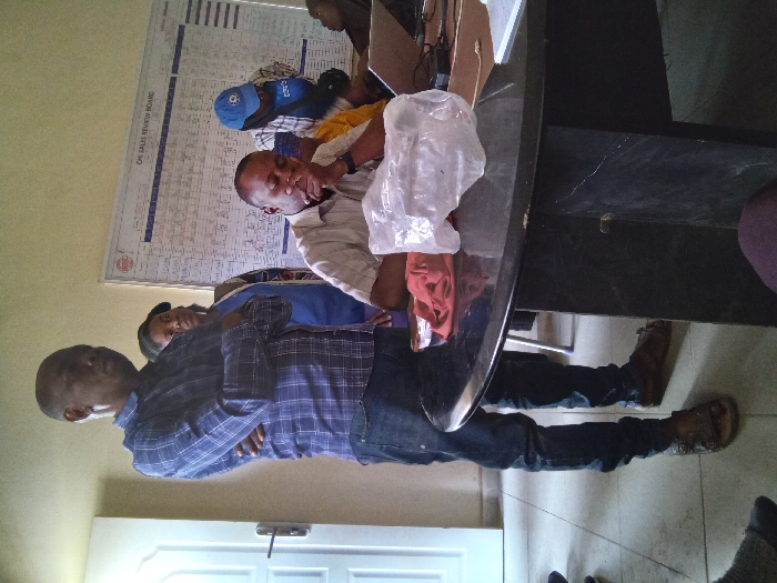 An interior room in an unspecified building in Unknown, Unknown. The room has light-colored walls and a tiled floor. A white paneled door with a silver handle is visible on the left. A large whiteboard, labeled "GM SALES REVIEW BOARD," is mounted on the back wall, featuring a grid filled with handwritten data. Five individuals of African descent are present. In the foreground left, a bald male stands with his arms crossed, wearing a blue plaid shirt, dark jeans, and brown sandals, looking towards the right. Behind him, a female in a blue top is partially visible, also looking right. Seated at a dark, possibly black, D-shaped table in the mid-ground is a male wearing a light-colored collared shirt and a dark watch, with his right hand covering his mouth/chin, looking downwards. Behind him, a male wearing a blue baseball cap, a light plaid shirt, a yellow undershirt, and a blue vest with a white logo leans over the table, looking down. To the far right, another person is partially visible, obscured by the table and other individuals. On the table, there is a crumpled clear plastic bag, a folded red cloth, a dark laptop, and various papers and cables. The scene depicts a gathering or meeting, with individuals exhibiting postures consistent with observation, contemplation, and engagement with materials on the table.