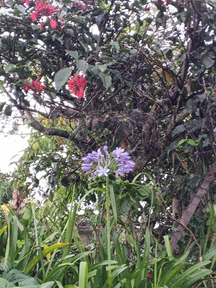The image displays a close-up botanical scene in Stueng Saen, Cambodia. The foreground is dominated by a dense arrangement of broad, dark green leaves. Centrally positioned in the midground, a prominent globular cluster of light purple flowers, identifiable as Agapanthus, stands on a tall, green stem. A dark-colored metal chain-link fence is partially visible behind the purple flowers, extending towards the left of the frame. The background consists of a dense mass of foliage from a large shrub or small tree, featuring numerous dark green leaves and intricate brown branches. Several clusters of bright red flowers are interspersed throughout this background foliage, particularly noticeable in the upper left and right quadrants. The sky, where visible through the dense canopy, appears uniformly bright white. No human figures or discernible actions are present.