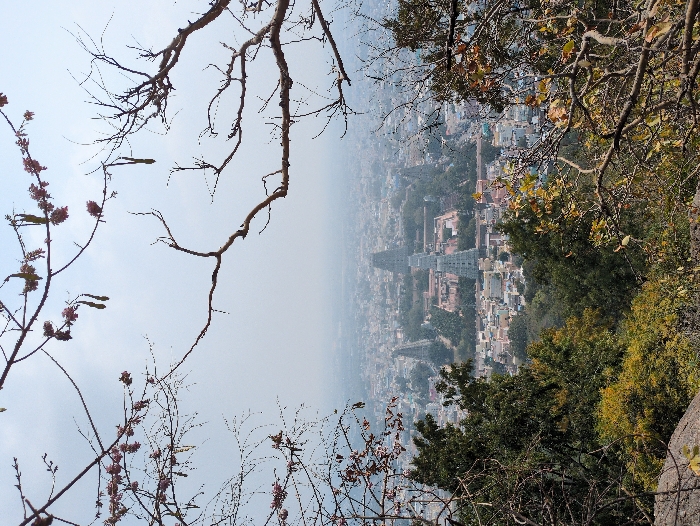 An eye-level shot from a mountain overlooks a city obscured by haze, framed by bare tree branches. The buildings below appear dense, and a tall structure with intricate designs stands out in the center. Foliage and rock formations flank the right side of the frame, while thin branches with small buds and leaves are scattered on the left. The sky is pale blue with hints of clouds.