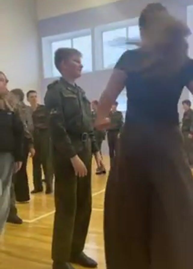 In a well-lit indoor gymnasium, a young woman dances with a boy in military uniform. The gymnasium has a polished wooden floor with painted lines, and several large windows provide natural light. The boy is in full military dress, complete with a camouflage uniform and shiny black shoes. The woman is dressed in a black t-shirt and loose, brown pants, and her long hair is styled in a ponytail. They are facing each other, hands joined, moving to the rhythm of music. In the background, other young people in similar military uniforms are visible, some also paired up and dancing, while others watch. The general atmosphere suggests a dance lesson or practice session.
