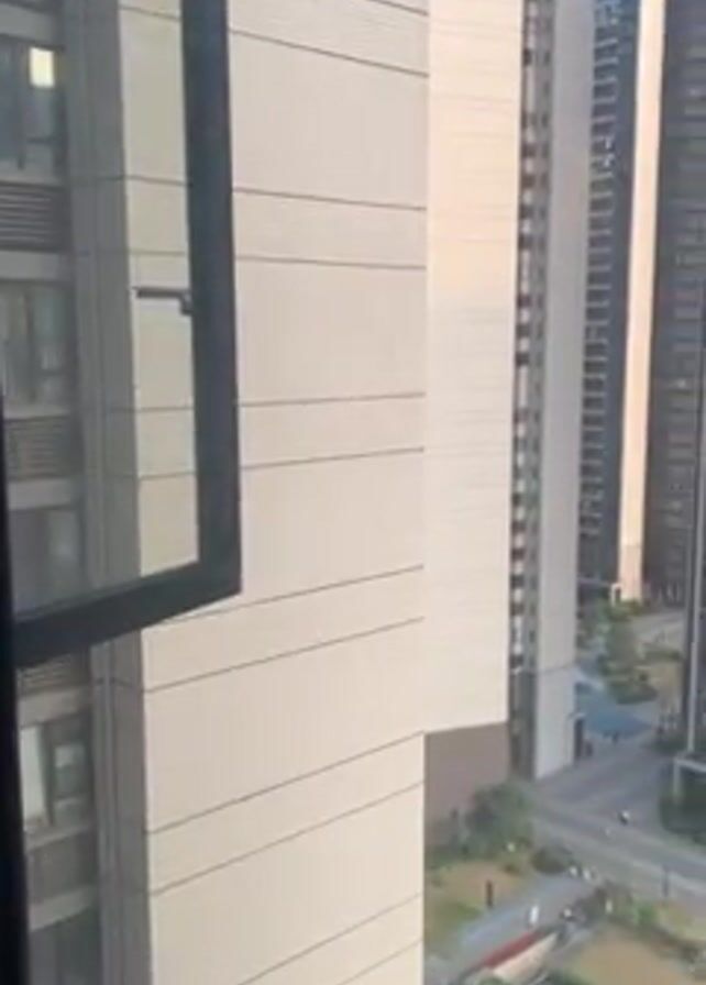 view from a high-rise building window. Outside, there are several other similar high-rise apartment buildings. Between the buildings is a paved area with greenery, including grass and trees. There is also a road with cars driving on it. In the distance, there are more buildings and a construction crane. The sky is hazy.