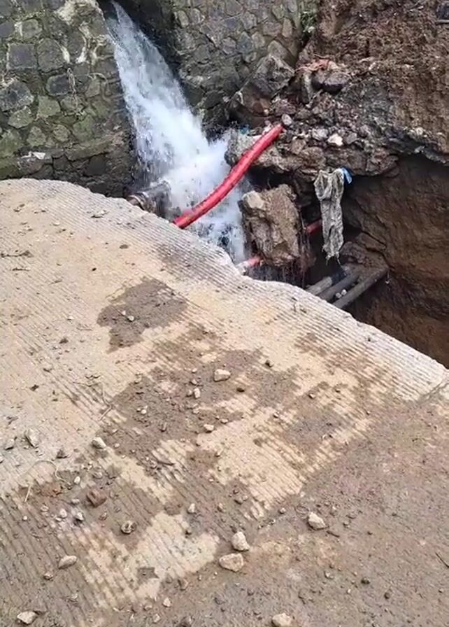 The scene shows water cascading from a stone structure into a hole. A red pipe lies in the path of the water flow. There are pieces of concrete scattered on the ground, along with some small rocks. The surrounding area appears to be muddy with a deep ravine on the right side. Some people can be seen standing on the structure.