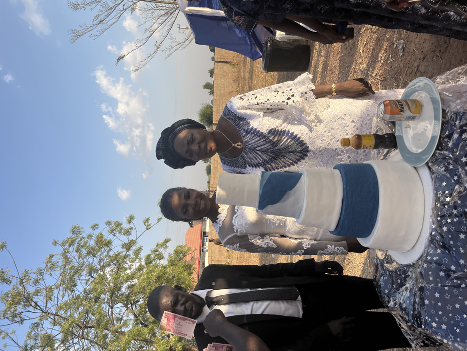 The image depicts an outdoor celebratory gathering in Unknown, Nigeria. In the foreground, a five-tier cake, predominantly white with blue accents and textured patterns, stands on a table covered with a clear plastic sheet over a blue and white star-patterned tablecloth. To the right of the cake, a white plate holds a yellow bottled beverage and an orange "MALTA" branded can. Three individuals are prominently featured behind the table. On the left, a male in a black suit, white shirt, and black tie has two Nigerian Naira banknotes (500 Naira denomination) held in front of his left temple by an unseen hand. He has a neutral expression. In the center, a female in a white long-sleeved lace gown, likely a wedding dress, smiles directly at the camera. To her right, an older female, also smiling, wears a white lace blouse with blue and black embroidery, a dark headwrap (gele), and a gold necklace with a pendant. Her left wrist displays a gold bracelet. A partial view of another person in a dark, patterned garment is visible on the far right. The background shows an open, dry, reddish-brown ground with scattered green trees and bare branches. In the mid-ground, a low light-colored block wall, a building with a red roof, and a dark blue tarp or tent structure are visible. A black trash bin is situated near the blue structure. The sky is clear blue with sparse white clouds, indicating daylight conditions.