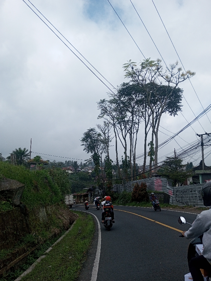 A curving asphalt road winds through a cloudy, overcast landscape. Several motorcycles are traveling along the road. Lush greenery borders the road on one side, while a fence and trees line the other. Power lines crisscross the sky above the trees. The scene depicts a common road with motorcyclists amidst the natural environment and infrastructure.