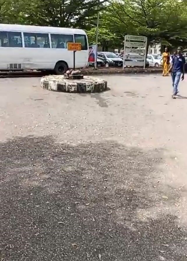 paved parking lot with a white minibus parked on the left. There is a low, circular concrete structure with a "Keep Right" sign on it. Several people walk through the parking lot, including a woman in a yellow dress. A yellow minibus is parked further down the lot. The background shows trees, a building, and a parking area with several cars. The sky is partly cloudy.