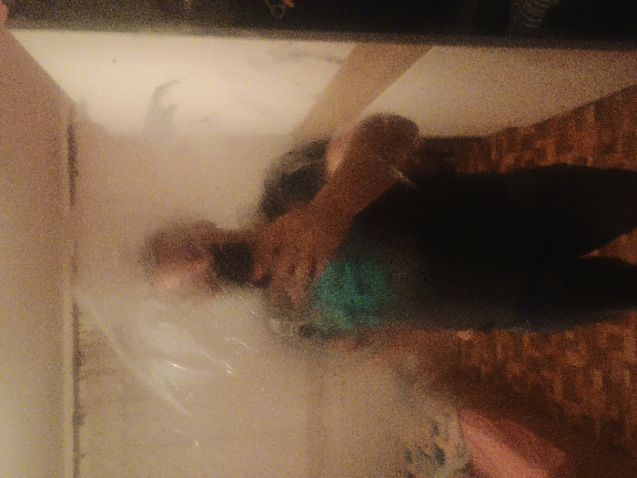 This image displays a blurry, full-body reflection of a male individual in what appears to be a mirror, situated within a room in Levice, Slovakia