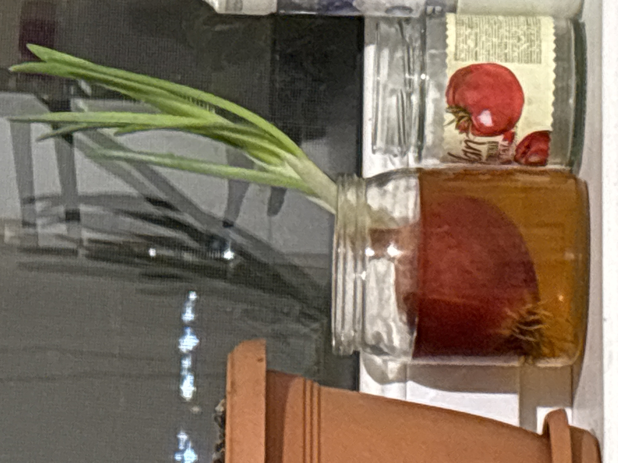 glass jar with green sprouts, likely scallions or onions, resting on what appears to be a terracotta pot. The jar contains water and is positioned near a window, as indicated by the reflections on the glass. Behind the jar is another glass jar with a tomato-themed label. The location is unknown, and cannot be determined from the image.