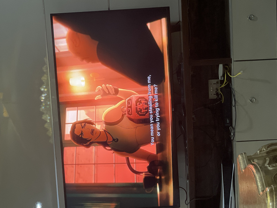 A television screen displays an animated scene. A woman with brown hair and a determined expression holds a red box with intricate designs. Above her looms a bald man. The subtitle reads, "You mean you stealing from me, or you trying to kill me?" The TV is mounted on a dark wooden cabinet. Visible nearby is a wall outlet with tangled wires, and part of what appears to be a PlayStation 5 console. The adjacent wall is white.