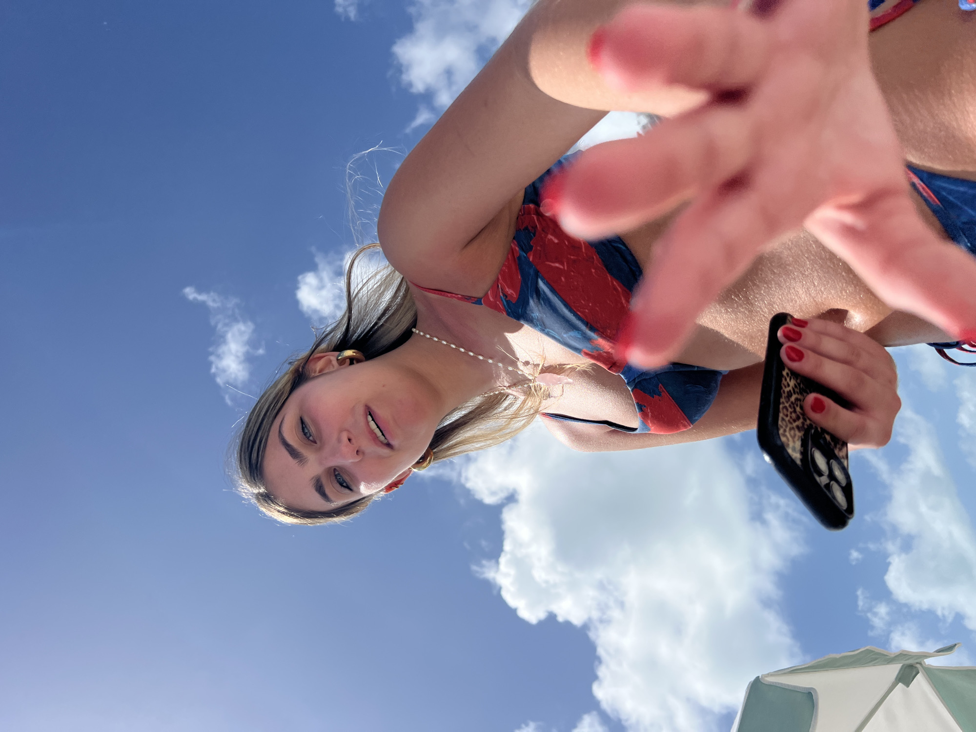A low-angle shot shows a young woman with fair skin and blonde hair, wearing a blue and red patterned top. She faces the camera with a slight smile, holding a cell phone with a leopard print case in her right hand, and extending her left hand towards the camera. Her nails are painted red. The background features a blue sky with scattered white clouds. A partial view of a beach umbrella is visible in the lower right corner. Based on the scene's characteristics and the presence of the beach umbrella, the location is likely Miami Beach, United States of America.