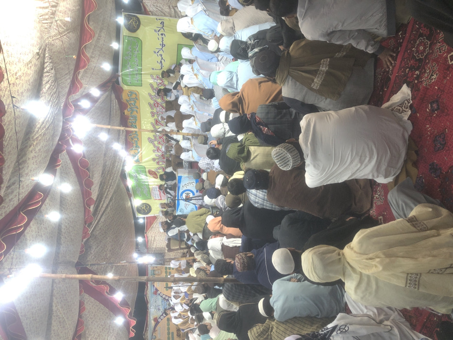 An overhead shot shows a large group of people sitting in rows, presumably for prayer or a religious gathering. The setting seems to be a tent or covered area, judging by the canvas roof with ornate lights hanging from it. A large banner with text in Arabic or Urdu is visible, along with a stage or platform at the front. Individuals are wearing various traditional garments and caps, indicating a diverse yet unified group. The carpeted floor suggests a formal or ceremonial space.