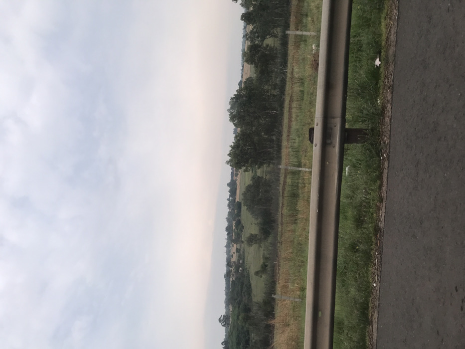 The image depicts an expansive, natural landscape in Sandton, South Africa, viewed from the side of a paved road under an overcast sky. The bottom of the frame shows a segment of a dark asphalt road surface. Immediately above the road is a strip of unkempt green and brown grass with scattered small white debris. A silver-grey metallic W-beam guardrail, with a visible dark support post, extends horizontally across the lower third of the image, separating the roadside from a large, undulating field. This field, occupying the midground, contains varying shades of green and light brown vegetation, suggesting a mix of wild growth and possibly agricultural land. Sparse, thin posts, likely part of a fence line, are visible within the field. Numerous clusters of trees and dense bushes are distributed across the midground and extend into the background, which features gently rolling, vegetated hills. The upper half of the image is dominated by a uniform, light grey overcast sky. No individuals, animals, or active human interactions are present in the scene.