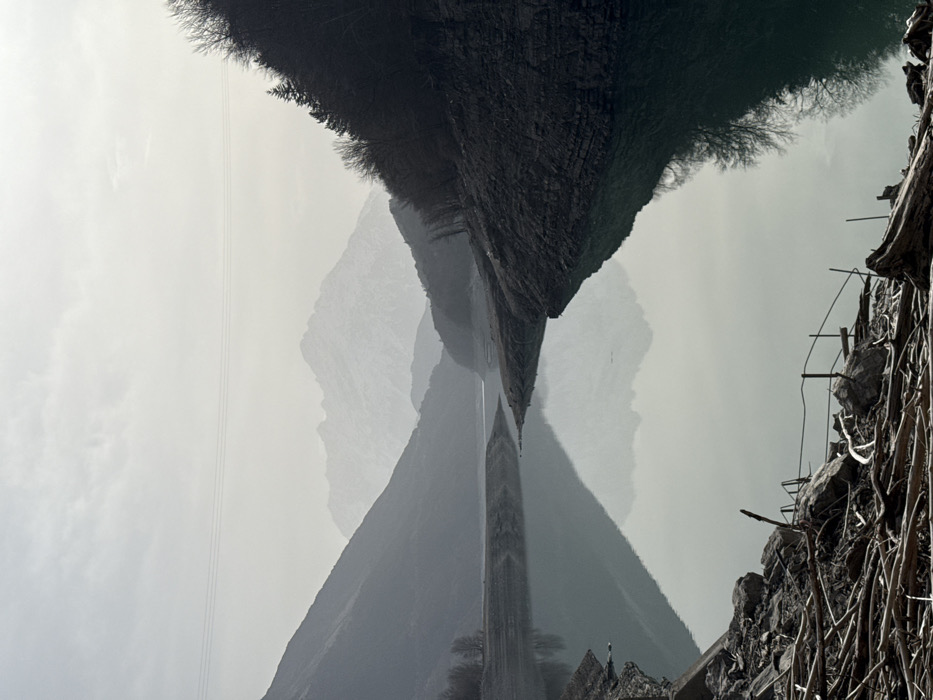 The image displays a wide, static landscape view of a mountain lake or reservoir located near Corps, France. The immediate foreground on the lower left features a substantial accumulation of dark, tangled driftwood and branches, intermingled with various rocks. Within this debris pile, partially exposed, are components of a rusted metal structure resembling a railing or fence. The central feature is a calm body of water, colored a muted greenish-grey, which mirrors the overcast sky and the surrounding topography. To the viewer's left, a dark, rocky mountain slope descends directly to the water's edge. On the right side, a similarly dark and rocky incline rises steeply, sparsely covered with bare deciduous trees and denser evergreen conifers. Both visible shorelines exhibit significant exposed earth and rock, indicating a low water level. Beyond the immediate water and closer slopes, multiple layers of mountains recede into a pronounced atmospheric haze, appearing progressively lighter and less defined towards the background. The sky is uniformly overcast and light grey. Three thin, dark power lines are faintly discernible stretching horizontally across the upper-mid section of the frame, positioned above the nearer mountain peaks. No human figures or active subjects are present in the scene.