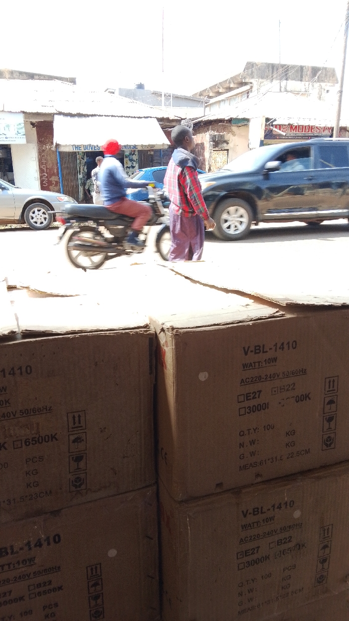 The image captures an active street scene in Shaba, Nigeria, under bright daylight. In the foreground, several brown cardboard boxes are stacked, partially obscuring the lower view. Visible labels on the boxes include "V-BL-1410," "WATT: 10W," "AC220-240V 50/60Hz," "E27," "B22," "3000K," and "6500K," along with quantity and measurement details, indicating they contain electrical components. The midground features a street with pedestrians and vehicles. A person wearing a red cap, a blue long-sleeved shirt, and reddish-brown trousers rides a black motorcycle from left to right, exhibiting motion blur on the wheels. To the right of the motorcyclist, a pedestrian, dressed in a red and black plaid long-sleeved shirt and purple trousers, walks in the same direction. A silver sedan is partially visible on the far left of the road, while a dark-colored SUV is seen moving behind the pedestrian on the right. The background reveals a row of one-story commercial buildings with corrugated metal roofs lining the opposite side of the street. Visible shop signs include "THE DOVES MERCHANDISE" and "CODE MODESIN GENRAL CONTRACT & SUPPLIES." The overall environment suggests a bustling urban or semi-urban commercial district.