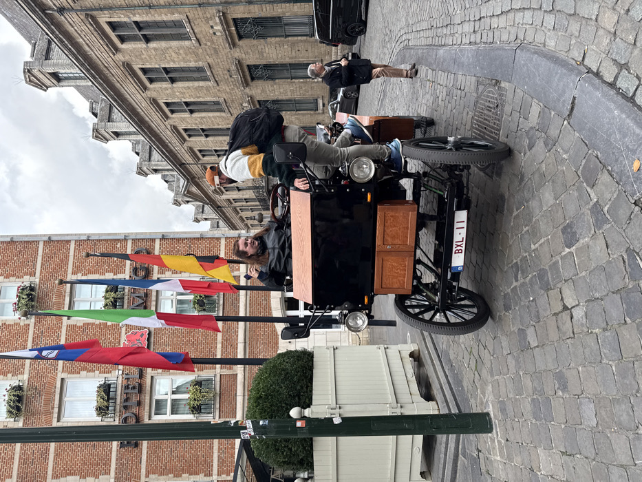 The image captures a street scene in Brussels, Belgium, on an overcast day. A black vintage-style automobile, resembling an early 20th-century horseless carriage, is positioned on a cobblestone street, displaying a Belgian license plate "B BXL-11". In the vehicle's driver's seat, a female with brown hair, wearing a dark jacket, is seated, holding a mobile phone in her left hand. A male individual, wearing a light brown cap, a multi-colored fleece jacket (white, yellow, green), grey pants, and blue sneakers, stands on the side of the vehicle, with his left foot on the running board. He carries a black backpack and faces the seated female. In the background, to the right of the vehicle, an older male in a light-colored coat and tan pants stands on the cobblestone pavement, observing the scene. On the left, a multi-story brick building, partially obscured by a dark pole, features "HOTEL" lettering above windows adorned with planter boxes. Four national flags are displayed on poles extending from this building: Slovenia (white-blue-red), Italy (green-white-red), France (blue-white-red), and Germany (black-red-gold). A large spherical green bush is contained within a white planter box near the hotel entrance. To the right, a multi-story stone building with classical architectural elements, including ornate window frames and roof detailing, lines the street. The street itself is paved with grey cobblestones, and a dark grey curb is visible on the right. Further down the street, a dark grey sedan and a black van are parked or moving.