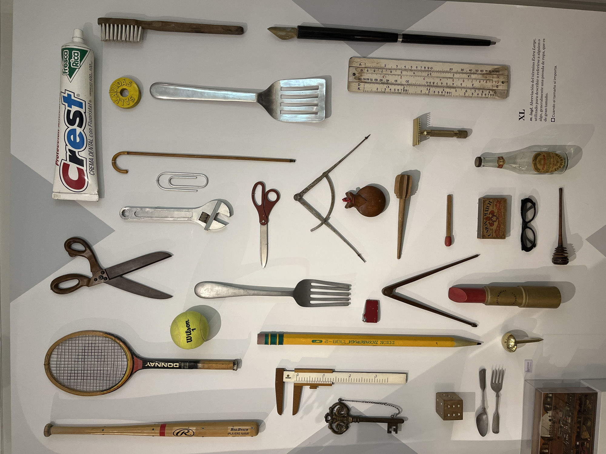This photograph shows an assemblage of diverse objects displayed on a white surface. These include a tube of Crest toothpaste, a wooden toothbrush, a yellow Adidas button, a metal spatula, a black pen, a slide rule, a safety razor, a walking cane, a paper clip, an adjustable wrench, red scissors, a pair of dividers, a wooden castanet, a wooden mallet, a wooden stick, a matchbox, glasses, a honey dipper, a pair of old scissors, a fork, a tennis ball, a fork, a lipstick, a pencil, a cork, a tennis racquet, a caliper, a key, dice, a small fork and spoon set, and a miniature diorama. The objects are arranged in a grid-like fashion. In the upper right, there is a text panel labeled "XL" in reference to "Extra Large." The overall composition appears to be part of an exhibition or display, possibly in a museum or gallery setting, located in Mexico City, Mexico.