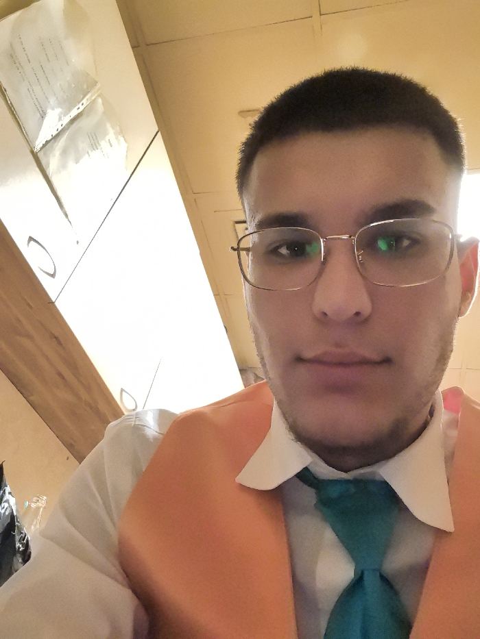 A low-angle, close-up indoor photograph depicts a single male individual, approximately 18-25 years old, looking directly at the viewer with a neutral expression. He has short, dark hair and wears gold-rimmed prescription glasses, exhibiting green reflections on the lenses. He is formally dressed in a white collared shirt, an orange vest or jacket, and a teal necktie. The upper left portion of the background reveals bright white light illuminating several documents secured within clear plastic sleeves. The ceiling or upper wall, visible in the upper background, is light-colored with subtle linear demarcations. The specific location within Sofia, Bulgaria, is not discernible from the visual information presented.