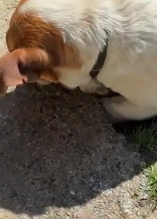 white and brown dog, possibly a Jack Russell Terrier mix, licking a wet concrete surface in an outdoor setting. The dog is lying partially on the concrete and partially on a grassy area. The person filming is standing close by and slightly away from the dog. The day appears to be sunny, and a shadow of the person filming is visible on the concrete.