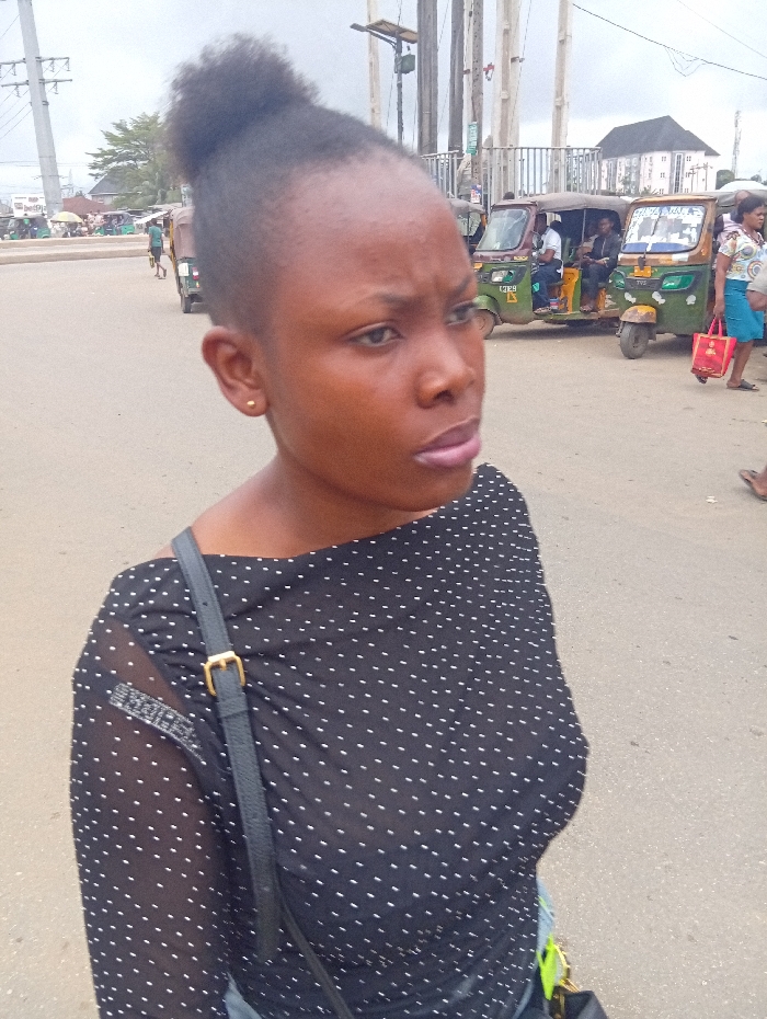 The image depicts a young Black female, likely in her early twenties, positioned in the foreground of a street scene in Ura Nta Umuarandu, Nigeria