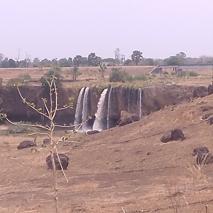 The image displays an outdoor landscape at an unspecified location, characterized by a series of cascading waterfalls and a dry, barren environment