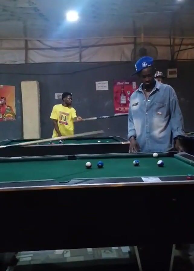 two men playing pool in what appears to be a recreational establishment, possibly a bar