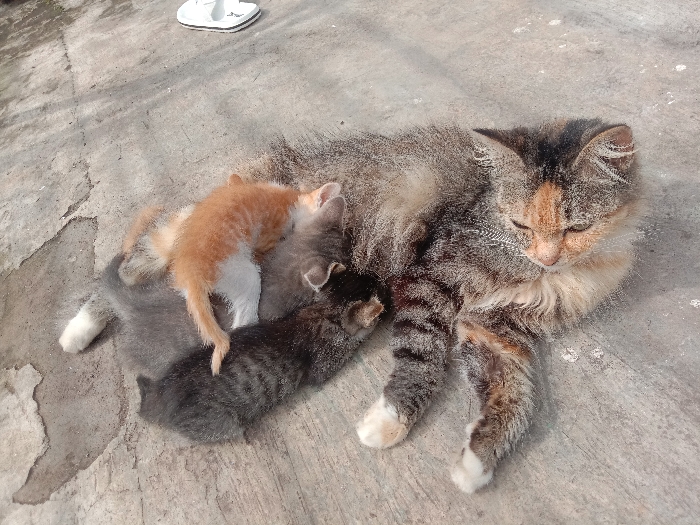 - "The image displays an adult domestic cat nursing three kittens on a concrete surface in Ciherang, Indonesia" by FM-TaKCH3, licensed under CC BY 4.0