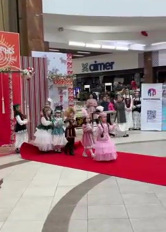 A group of children dressed in costumes walk along a red carpet in a shopping mall, clapping their hands