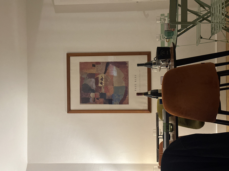 The image depicts an interior dining scene within a private residence or establishment in Paris, France. A light-colored wall serves as the backdrop for a framed print of Paul Klee's artwork "Zwei Berglandschaften und ein Beduine, 1919," which features abstract, earthy tones and stylized camels. Below the artwork, a dining table is set for multiple individuals. A raclette grill is positioned on the left side of the table, accompanied by several clear wine glasses and at least one green glass. Towards the center of the table, two wine bottles (one red, one dark) stand next to a small black item, possibly a camera or accessory bag. Seating includes an orange upholstered chair in the foreground, a partially visible green upholstered chair, and a light green metal outdoor-style folding chair on the right. A dark garment hangs over an unseen chair on the far left. The scene is illuminated by warm, artificial ambient lighting. No individuals are present or engaged in any actions or interactions.