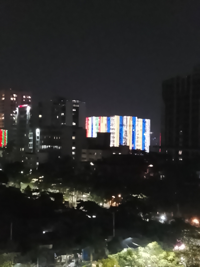 The image depicts a nighttime urban landscape in Dhaka, Bangladesh, viewed from an elevated perspective. The sky is dark and featureless. In the foreground, a dark expanse of foliage and trees, likely a park or green space, occupies the lower third, dotted with indistinct, diffuse light sources from streetlights or distant buildings. In the midground and background, multiple high-rise buildings dominate the skyline. On the left, a multi-story building exhibits vertical strips of red and green lights. Centrally, a large, prominent building is extensively illuminated with vertical bands of multicolored lights, including blue, white, green, and red, covering its facade. To the far right, another tall building appears mostly dark with minimal illumination. No discernible individuals, specific actions, or interactions are visible within the frame. The overall scene is characterized by dense urban architecture and artificial illumination against a dark night sky.