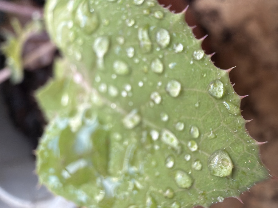 The scene is located in Tel-Aviv, Israel. The image presents a close-up, macro view of a vibrant green plant leaf heavily covered in numerous clear, spherical water droplets of varying sizes. The leaf itself is the primary subject, in sharp focus, displaying visible venation and a textured surface. Its margins are distinctly serrated, featuring small, sharp, reddish-pink spines or thorns particularly prominent along the bottom and right edges. The water droplets reflect ambient light and adhere to the leaf surface, appearing transparent. The background is significantly blurred, revealing indistinct elements: a dark brown mass, consistent with soil or potting mix, at the upper right, and a light-colored, possibly white or grey, cylindrical object, likely the rim of a plant pot, at the upper left. No individuals, specific actions, or direct urban environmental markers are present within the frame; the focus is solely on the botanical subject.