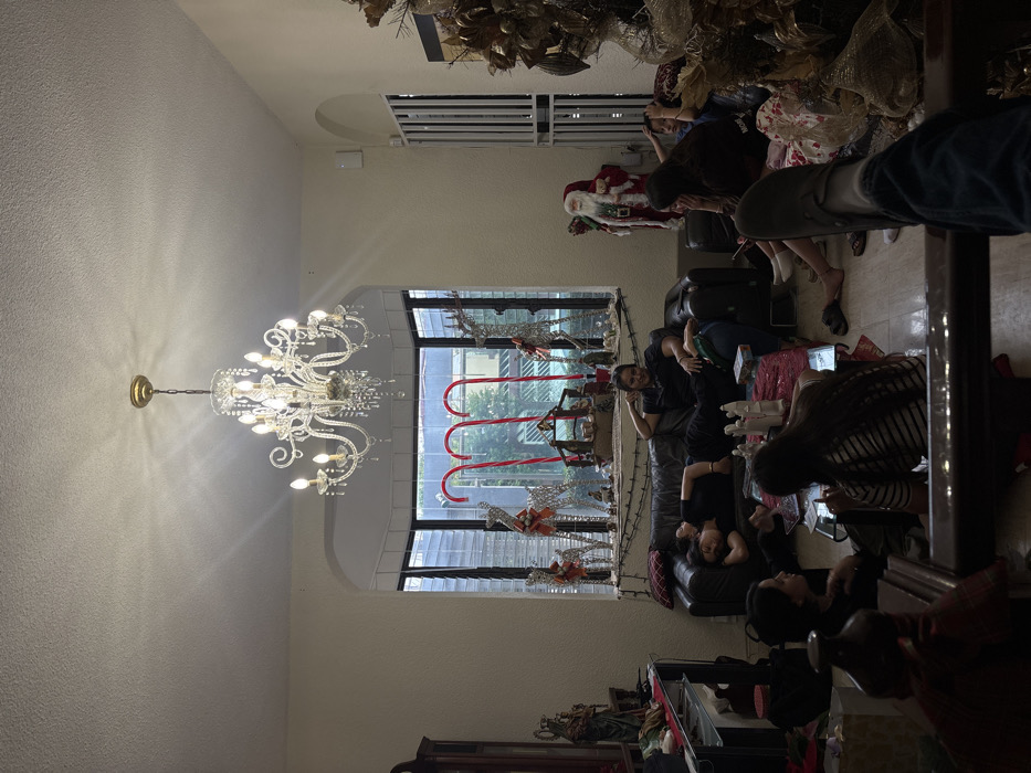 A chandelier hangs from the ceiling, illuminating a living room filled with people