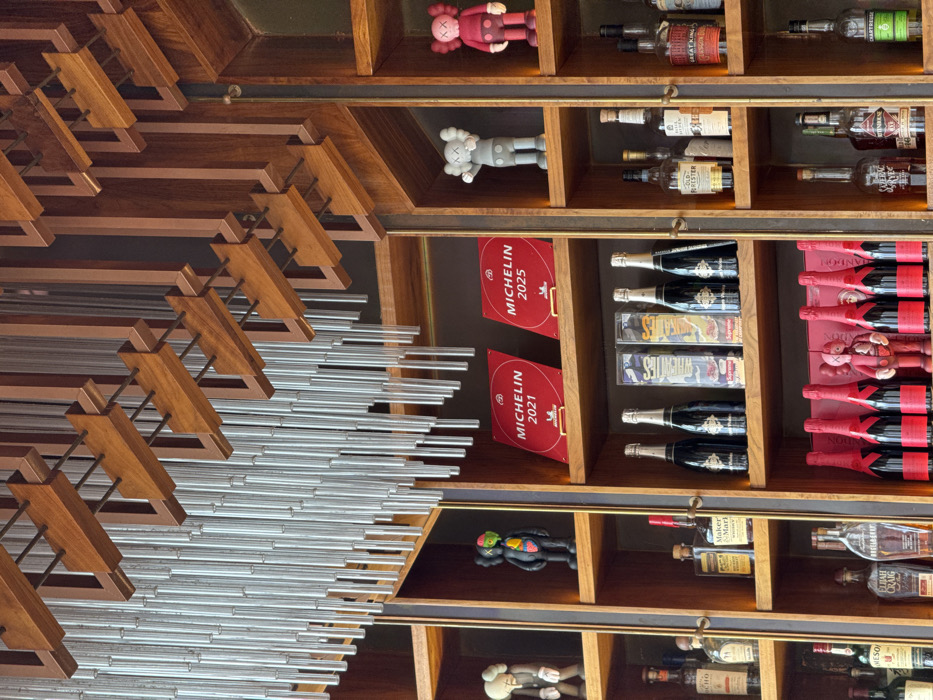 The image showcases a multi-tiered wooden shelving unit, displaying an assortment of items. Notable elements include rows of wine and champagne bottles, interspersed with toy figurines, including KAWS figures in varying colors. Red Michelin guide plaques, labeled "2021" and "2025", are displayed near the bottles. Liquor bottles, labeled "Maker's Mark," "Elijah Craig," and "Old Forester" are visible on lower shelves. An artistic ceiling design of horizontal silver rods layered with dark brown beams dominates the left side.