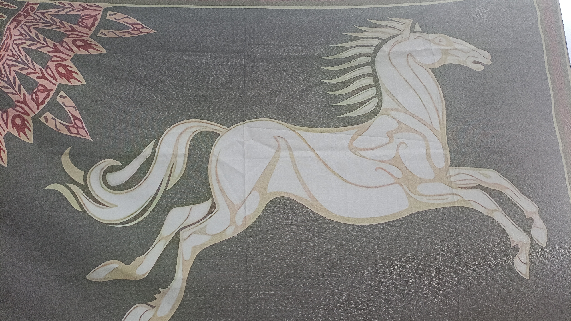 patterned tapestry or fabric depicting a stylized white horse in mid-gallop against a grey background