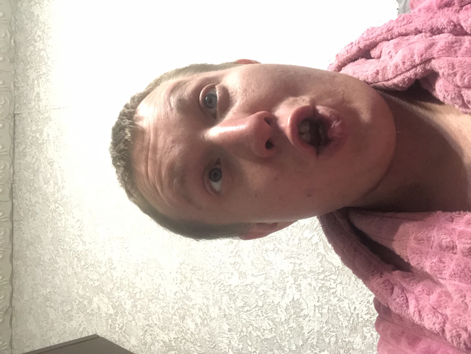 The image displays a close-up, upward-angled shot of an adult male indoors, purportedly located in Chaikovsky, Russia. The male subject has short brown hair and blue eyes, which are directed upwards. His mouth is wide open, suggesting a vocalization or an expression of surprise. He is partially clad in a pink, textured garment, resembling a towel or bathrobe, draped around his neck and shoulders. The background consists of a light-colored wall featuring a distinct textured pattern, consistent with wallpaper. A segment of decorative crown molding is visible along the top edge of the wall. To the upper left, a dark, vertical edge, possibly part of furniture or a doorframe, is discernible. The scene is brightly illuminated, indicating an indoor setting with artificial light sources.