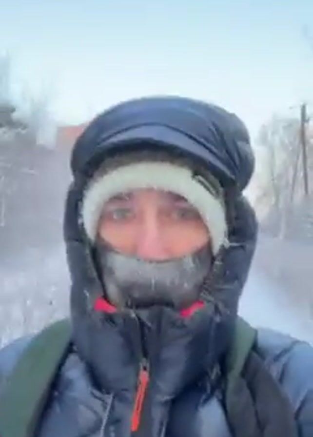 A man standing outside in the snow takes a selfie video. The man is wearing a blue down jacket, with a dark hat over a lighter knitted hat. He is wearing a face covering, with snow on his facial hair and hood. He also has a green backpack. The background appears to be a path covered with snow, lined with trees. The sky is overcast and pale blue. The camera zooms in on the man's face, focusing on his wide-open blue eyes.
