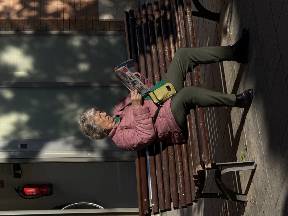 - "An elderly woman with gray hair is seated on a weathered, dark brown slatted wooden bench in L'hospitalet De Llobregat, Spain" by FM-hin5S2, licensed under CC BY 4.0