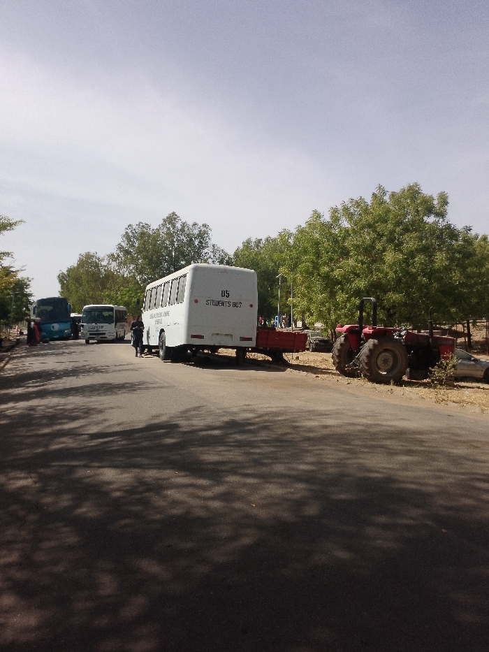 The image depicts an outdoor scene on a paved road in Dabawa, Nigeria, under bright daylight conditions. A white student bus, marked "05 STUDENTS BUS" on its rear, is centrally positioned on the right side of the road, facing away from the viewer. To its right, parked on a dirt verge, is a red tractor with large rear wheels, positioned behind a red flatbed trailer. A light-colored sedan is partially visible behind the tractor. Further down the road, behind the white student bus, a smaller white minibus and a blue bus are parked. One individual in dark attire is visible near the left rear of the white student bus. Two to three additional figures in colorful clothing are observed near the blue bus in the distance. The road surface exhibits dappled shadows from unseen trees on the left. The scene is bordered by numerous leafy green trees under a bright, hazy sky.
