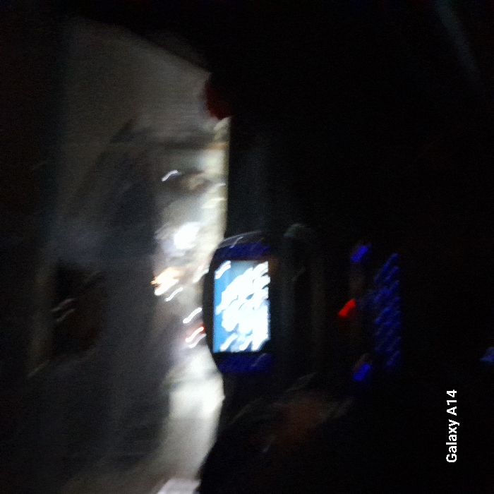 A nighttime image shows a blurred street scene through a window, with streaks of light indicating moving vehicles. In the foreground, a blue-framed device with a bright screen displays an unintelligible pattern. To the right, a keypad with illuminated blue buttons is visible. The overall scene is dark and grainy, captured by a Samsung Galaxy A14, as indicated by the watermark.