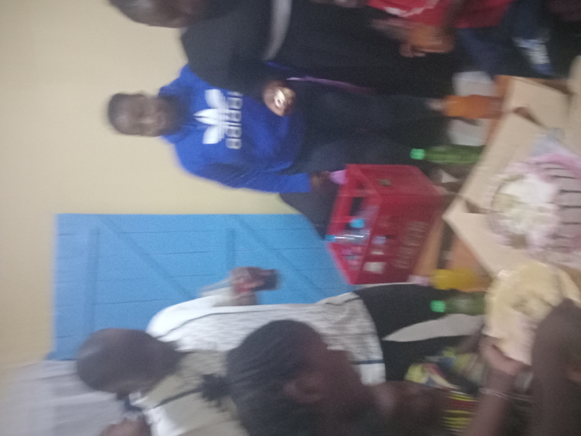 gathering of people in what appears to be an indoor space. A person wearing a blue Adidas sweatshirt is visible, along with a red crate and various bottles. A box and other miscellaneous items are on a surface nearby. The image appears to be taken in Matulo ward, Kenya.