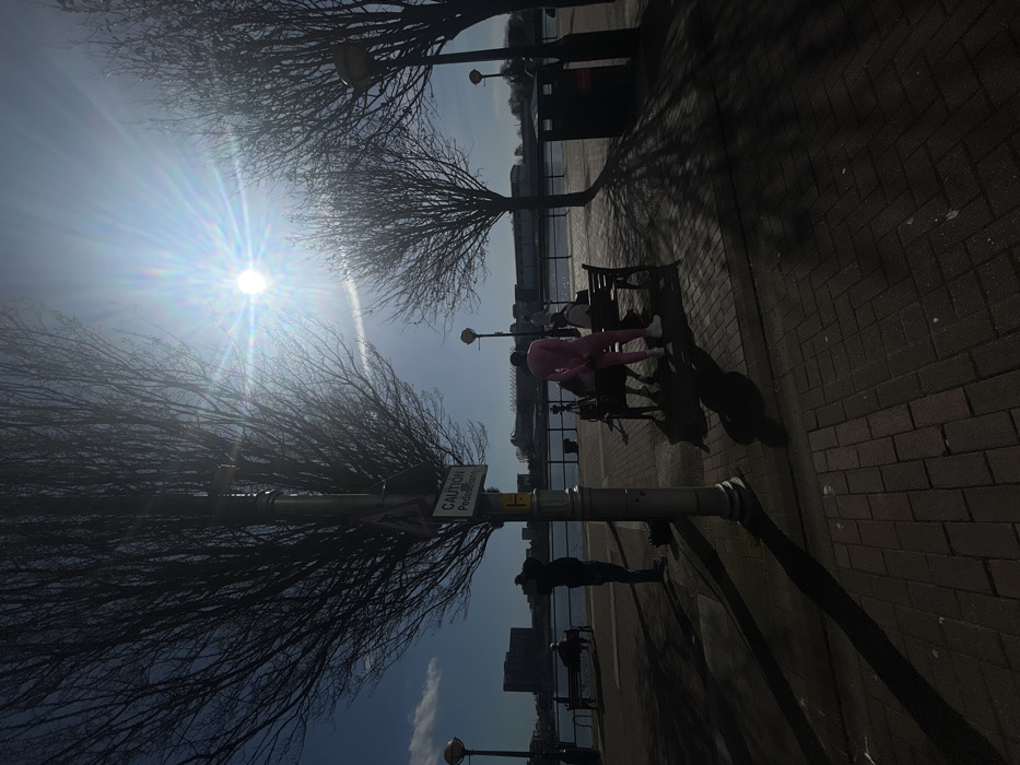 - "An outdoor scene captured in Salford, United Kingdom, depicts a paved waterfront promenade under a bright, low sun causing significant lens flare and long shadows" by FM-MuDR93, licensed under CC BY 4.0
