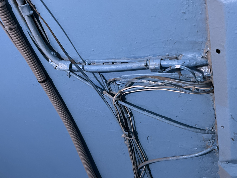 The image displays a section of a medium blue-painted wall, showing uneven paint application and surface texture. A gray, corrugated flexible conduit runs horizontally across the upper left quadrant. On the right side, a vertical rigid metal conduit, also painted blue, is secured to the wall with multiple clamps. Several insulated electrical cables, primarily painted blue, are affixed horizontally to the wall using ties and clamps, with some segments exhibiting slack. A bundle of unpainted, multi-colored electrical wires (white, gray, black, brown) hangs loosely from a junction point located near the center-right. A horizontal ledge or baseboard, painted in the same blue, is visible at the bottom of the frame and contains a small circular hole. No people, active interactions, or specific architectural details for precise location identification within Krasnoyarsk, Russia, are visible.