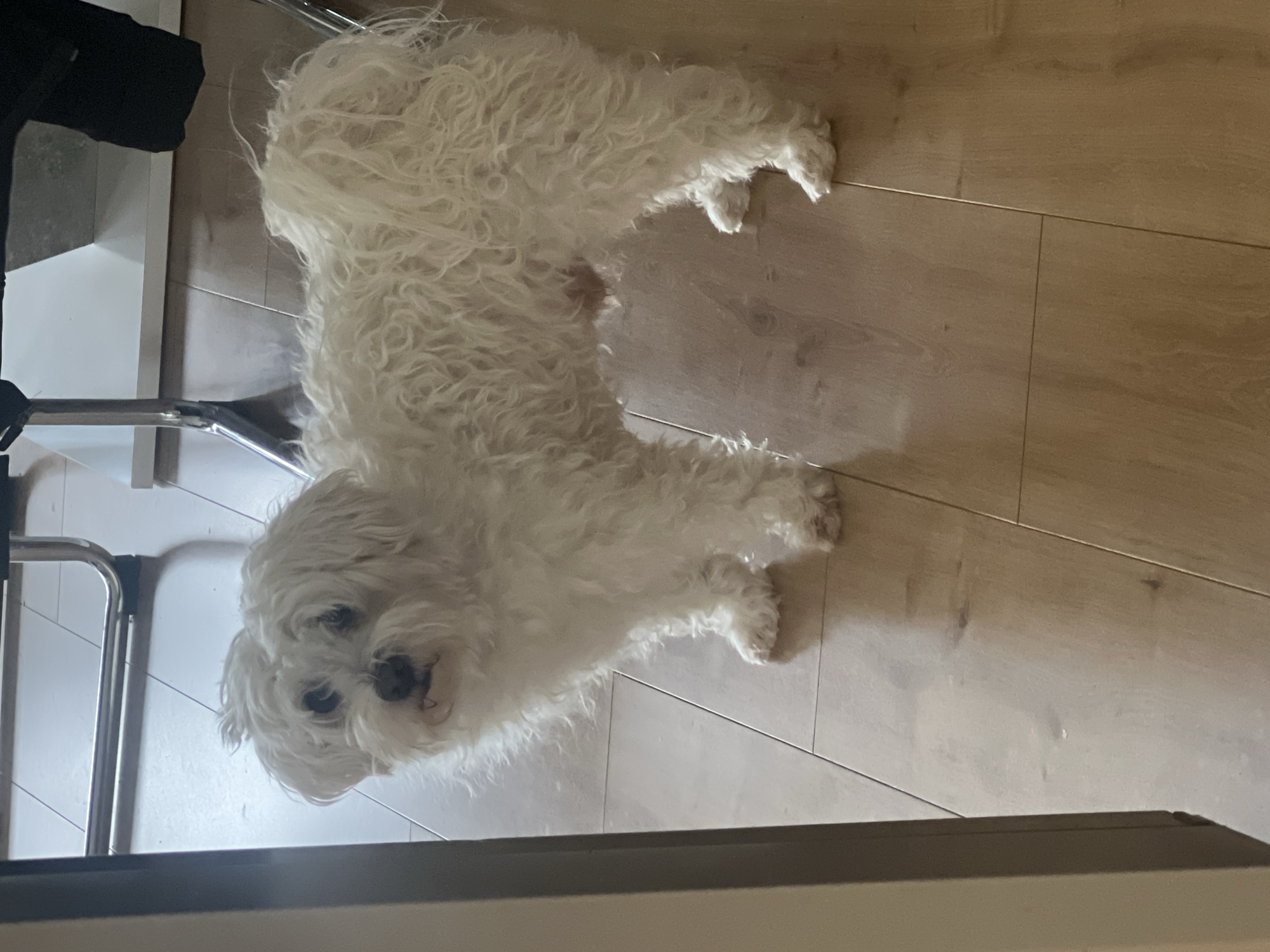 - "A small, white canine with curly, dishevelled fur stands on a light brown wooden floor" by FM-g4ocG3, licensed under CC BY 4.0