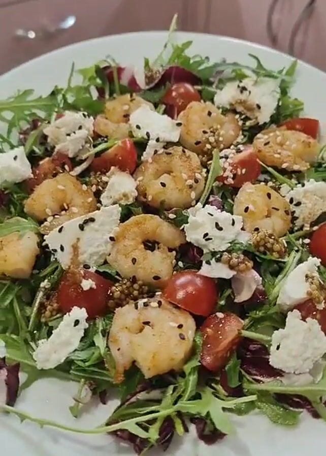 white plate filled with a salad composed of various ingredients. The base of the salad appears to be a mix of arugula and some red lettuce. Scattered on top are cooked shrimp, cherry tomatoes, and chunks of soft white cheese, possibly feta. There are also what appear to be mustard seeds and black sesame seeds sprinkled over the salad. The plate is set against a light-colored countertop with what looks like a pale pink cabinet in the background.