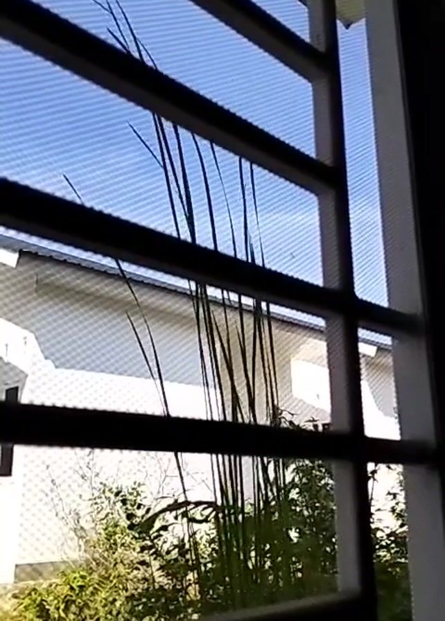 The camera is positioned inside a building, looking out through a window with dark bars and a screen. Outside, tall grass or weeds are visible, swaying slightly in the breeze. Behind the grass is a glimpse of a white house with a gray roof against a blue sky with light clouds. The scene appears to be taken on a clear day.