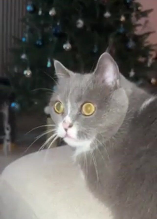 gray and white cat sitting on a light-colored surface. Behind the cat is a decorated Christmas tree, the room is lit with a soft light. The cat has golden eyes and its gaze is focused to the left.