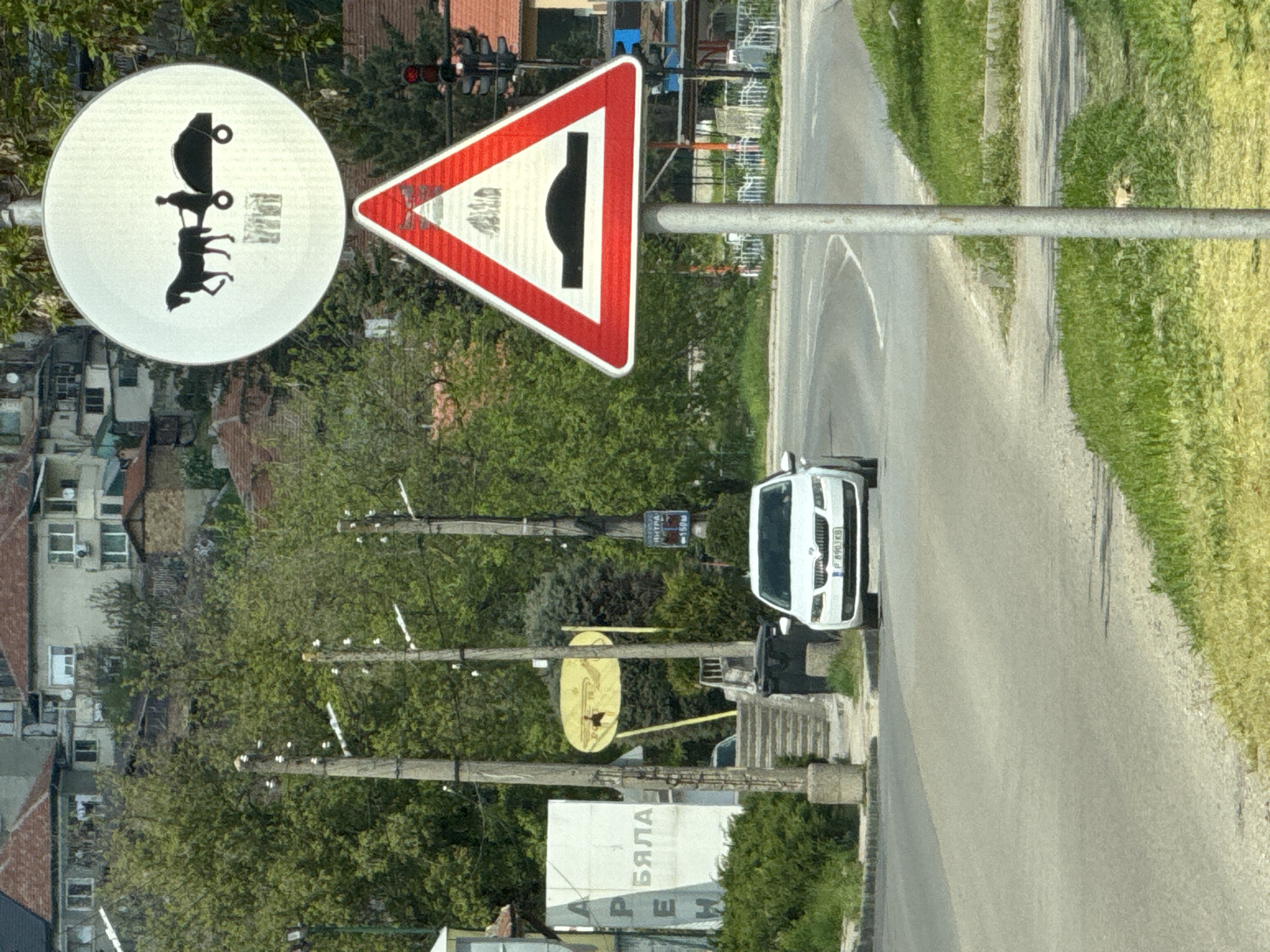 The image presents a street scene in Byala, Bulgaria. A white car is traveling on a gray asphalt road bordered by green vegetation. Above the road, a signpost displays two traffic signs: a round sign with a black silhouette of a horse-drawn carriage and a triangular warning sign with a red border and a symbol indicating a bump or uneven road surface. Traffic lights are visible in the background, with at least one red light illuminated. Power lines and utility poles run alongside the road, and in the background, there are buildings, some with red tile roofs. In the lower part of the image, a sign appears to have text in Cyrillic, including the word "БЯЛА."